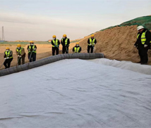 膨潤土防水毯又叫膨潤土墊每平方克重在3000克--6000克之間,屬于重貨因此在鋪設時現場人員在10人左右,材料鋪設后所有人員負責調整相鄰兩卷防水毯搭接30cm-50cm,調整完成后安排一人在搭接重合面撒搭接粉,相鄰兩卷完成后在進行下一卷的鋪設,該兩卷完成后如需回填在鋪設第三卷過程中前面兩卷就可以回填了,形成流水線作業(yè)模…